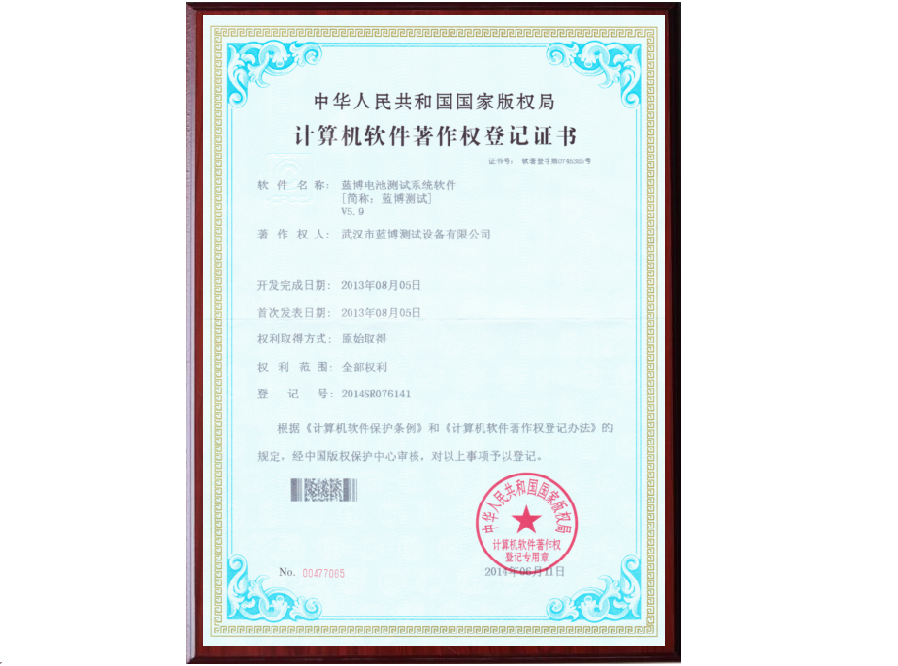 根據(jù)《計算機軟件保護條例》和《計算機軟件著作權登記辦法》的規(guī)定,經(jīng)中國版權保護中心審核,中華人民共和國國家版權局對藍博公司提交的電池測試系統(tǒng)軟件著作權認定為原始取得并予以登記,從頒證之日起,這套電池測試系統(tǒng)軟件的版權將得到中國版權保護中心的有效保護。
